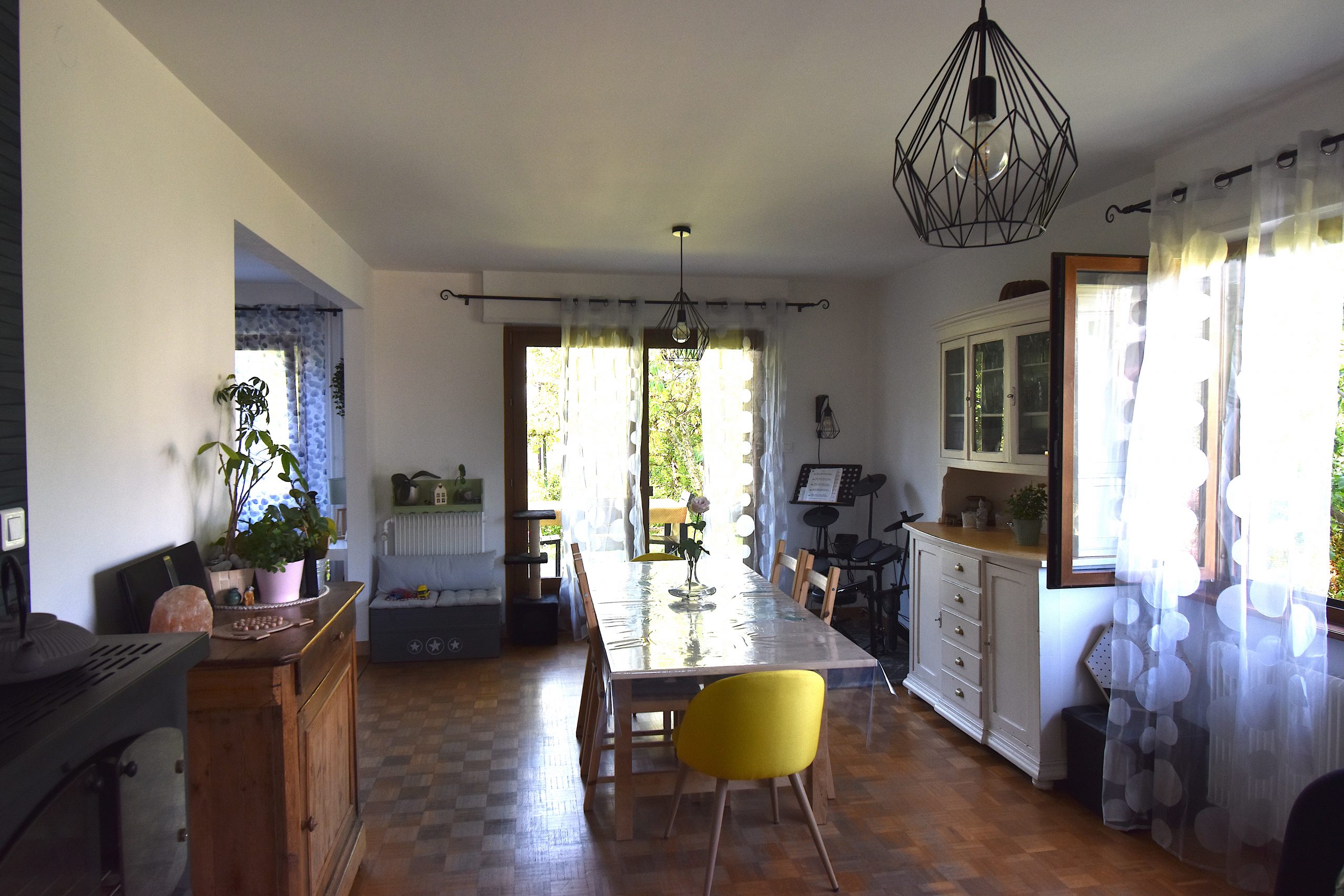 Le séjour avec parquet massif est aussi équipé d’un beau poêle à bois.